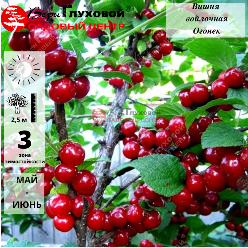 Ягоды темно-красные, сердцевидной формы, с крупной косточкой внутри. Плоды растут на коротких плодоножках, которые легко отделяются и выглядят очень декоративно