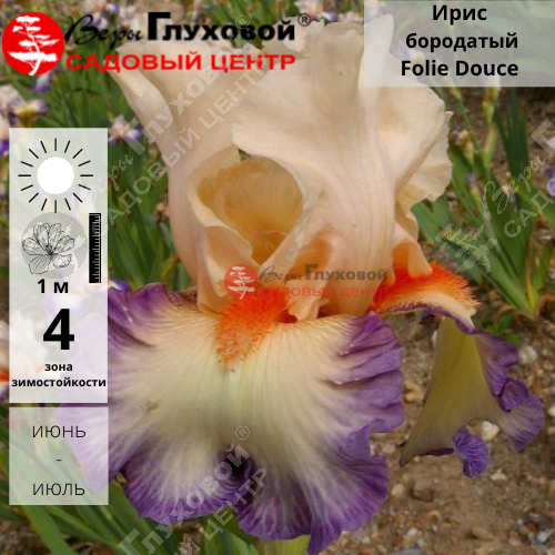 Стандарты кремовые с крупной гофрировкой. Фолы персиковые с широкой аметистовой плоеной полосой по краю лепестка. Бородка крупная оранжево-алая. Формирует 8 бутонов на ветвистых стеблях.