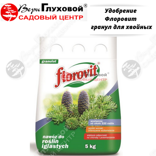 FLOROVIT (ФЛОРОВИТ) для хвойных растений, Гранулированное садовое удобрение содержит минеральные компоненты, подобранные с учетом потребностей декоративных хвойных растений, таких как: тис, лиственница, можжевельник, кипарис, ель, сосна, пихта и др. Регулярное использование обеспечивает красивый вид и интенсивный рост удобряемых растений, а также уменьшает обесцвечивание хвои в зимний период.