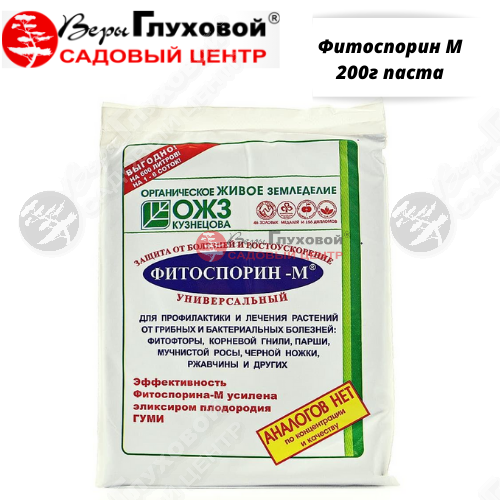 Микробиологический препарат, предназначенный для защиты растений от комплекса грибных и бактериальных болезней. Действующее вещество: Bacillussubtilis 26 Д, 100 млн. кл./г. Выпускается в виде пасты. Фитоспорин эффективен против широкого спектра грибных и бактериальных заболеваний, в том числе против парши, увядания, черной ножки, фитофтороза, плесневения семян, корневых гнилей, гнилей всходов, мучнистой росы, бурой ржавчины, пыльной головни, пузырчатой головни, альтернариоза, ризоктониоза, фузариоза, септориоза и многих других. Применяется для обработки почвы и компоста, предпосевного замачивания всех видов семян, черенков, корней, луковиц и клубнелуковиц. Также для полива комнатных растений. Обработка агропродукции перед закладкой на хранение путем опрыскивания или обмакивания. Обработка растений в период вегетации. Препарат не имеет срока ожидания. Период защитного действия- от посева до созревания и хранения урожая. Не фитотоксичен. Класс опасности – 3 (умеренно опасное вещество).