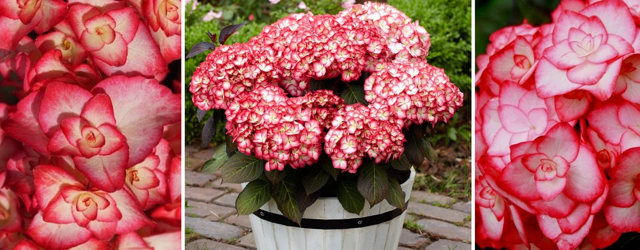 Ее удивительные по красоте цветы имеют матово-белую окраску с розовой каймой. Крупные, круглые соцветия почти полностью покрывают темно-зеленую с сиреневым отливом листву и используются для срезки. Цветет Мисс Саори все лето. Куст вырастает не выше 1 метра, поэтому сорт отлично подходит для высаживания в уличные вазоны на верандах.