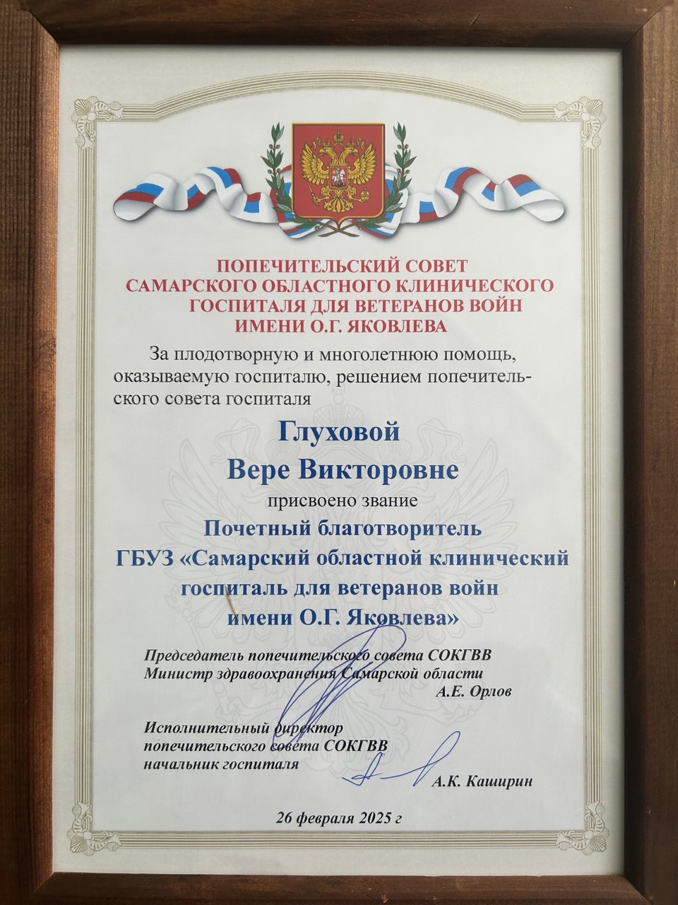 Вере Викторовне Глуховой присвоено звание Почетный благотворитель ГБУЗ "Самарский областной госпиталь для ветеранов войн имени О.Г.Яковлева"